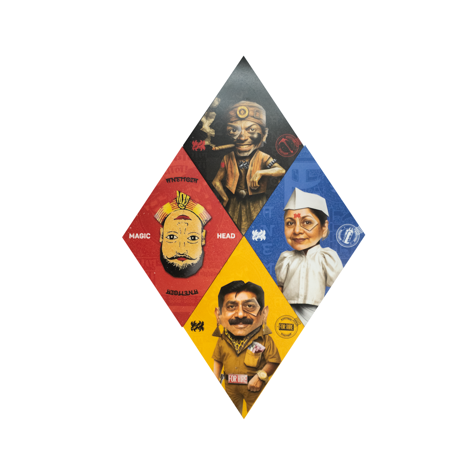 The coasters, a set of three, depict the different archetypes we take inspiration from as we imagine them. The Rickshaw Driver, the Dabbawala, the Coal Miner, the Magic Head, and the Anemoia Bazaar. Made using an acrylic base, digitally printed. Made in collaboration with Jay Pimpalkhare.