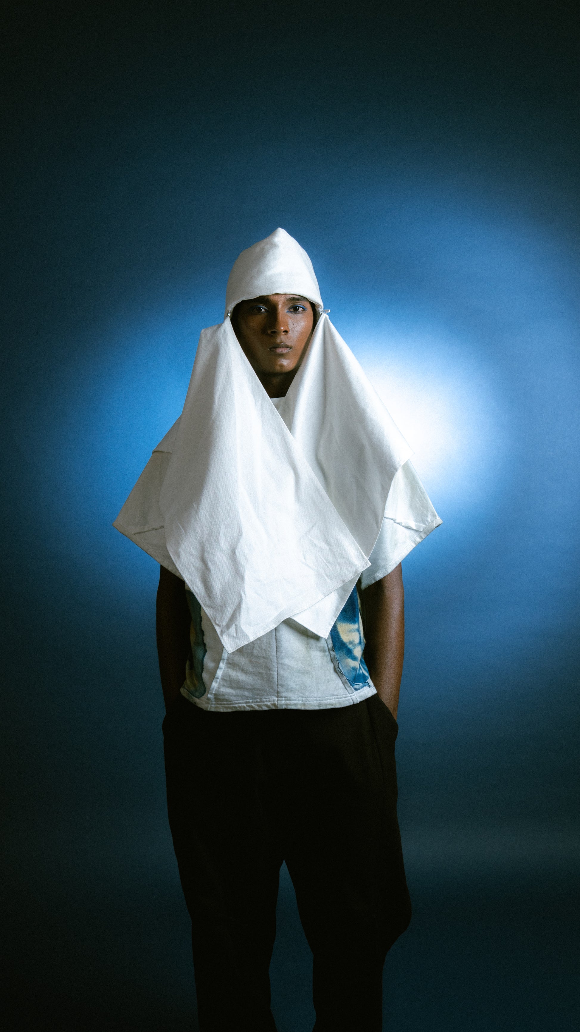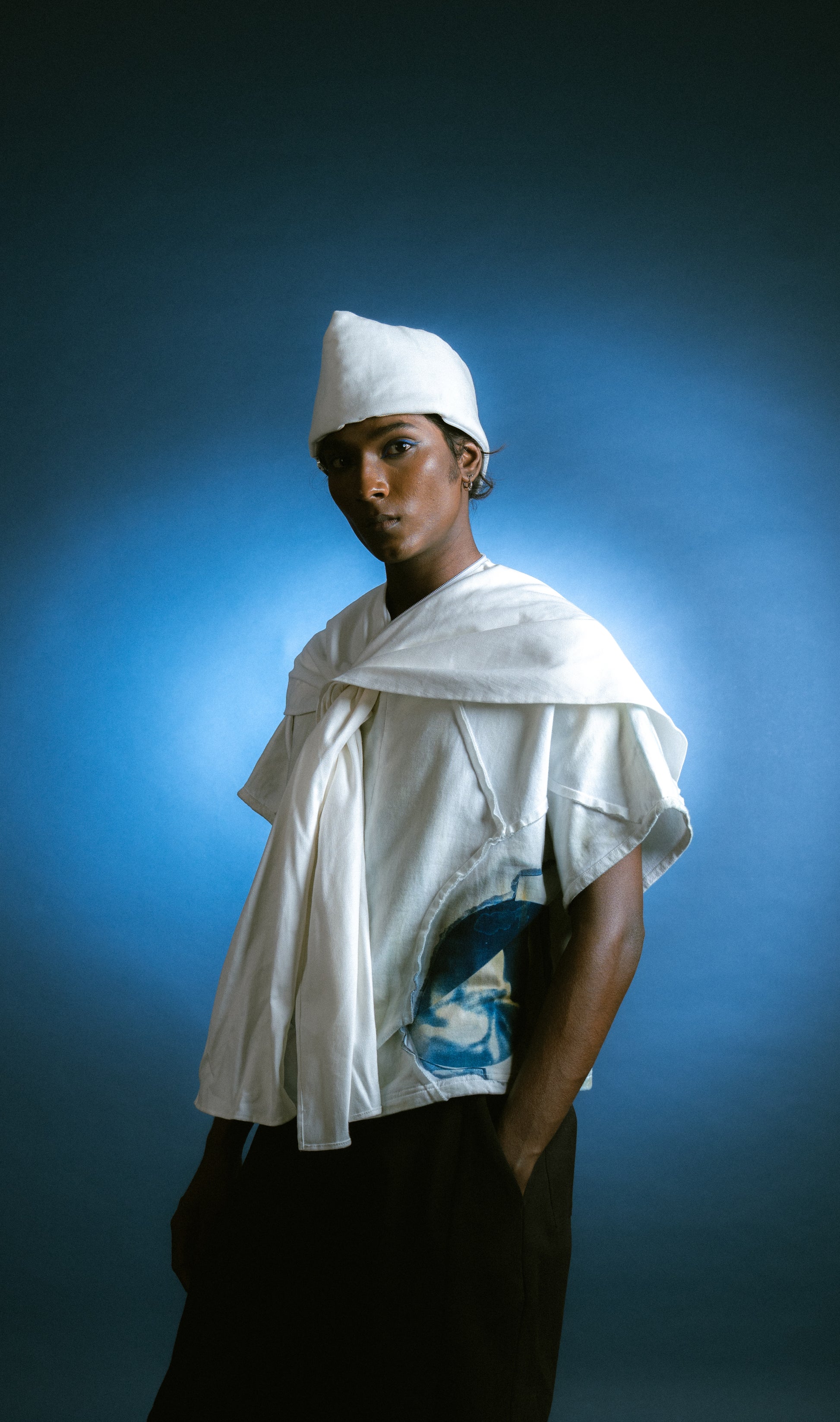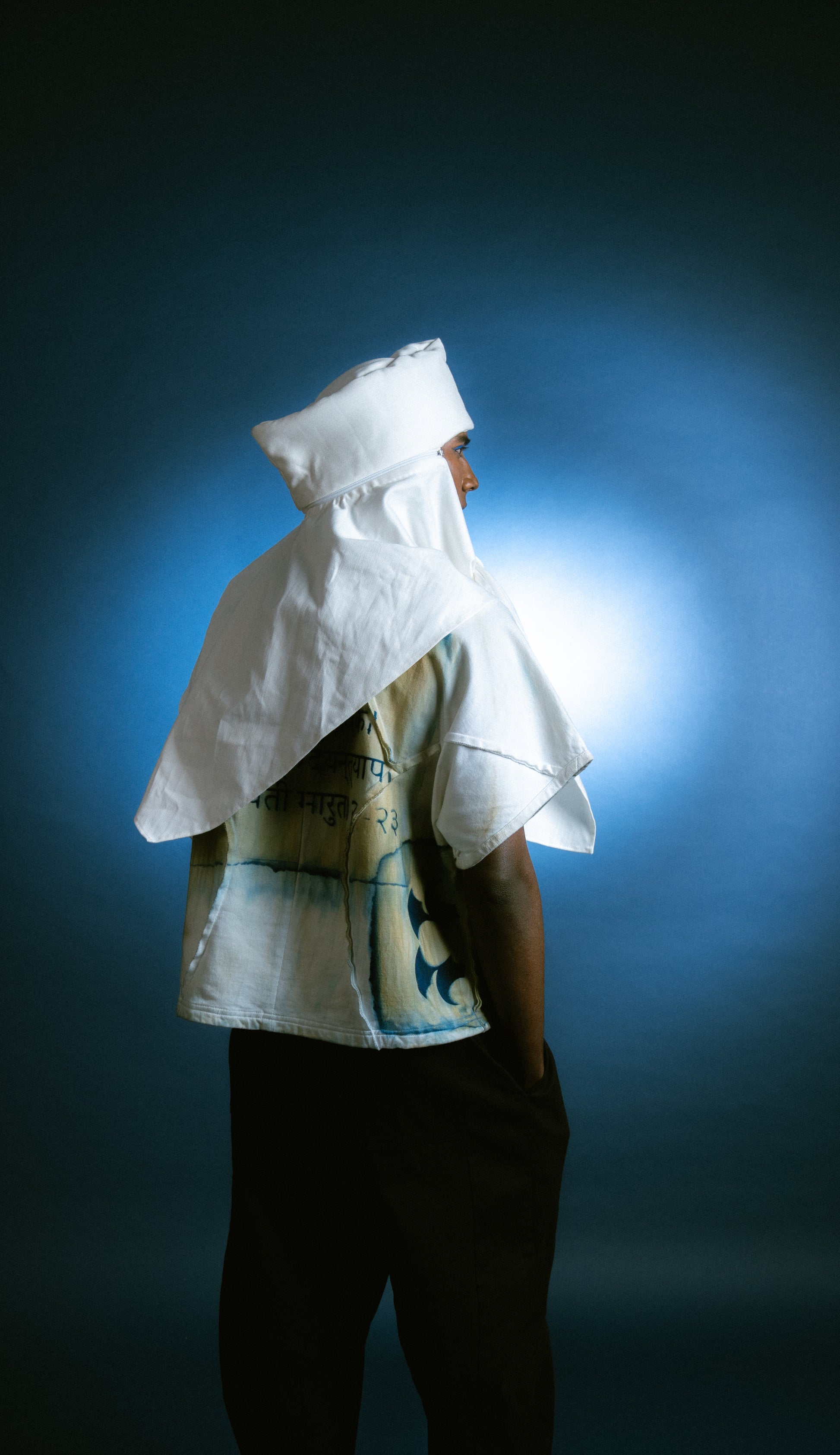 The Modular Nehru Topi elevates a classic symbol of work and identity. This padded cotton canvas hat is constructed in two parts—a hat and a scarf—joined with a zipper. The two can be worn together or separately, allowing for three unique silhouettes. The form is exaggerated at the crown, playing with proportion and presence.