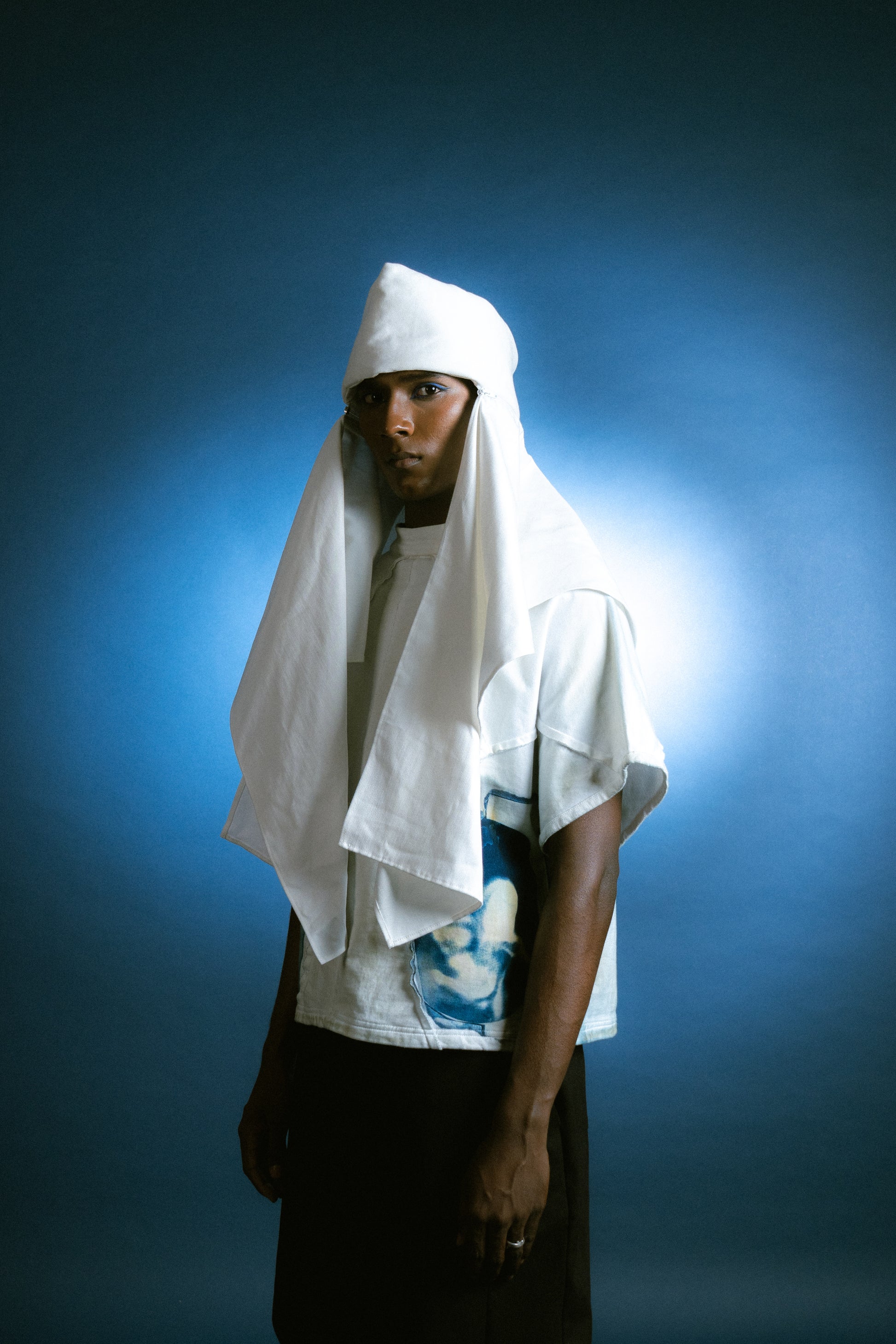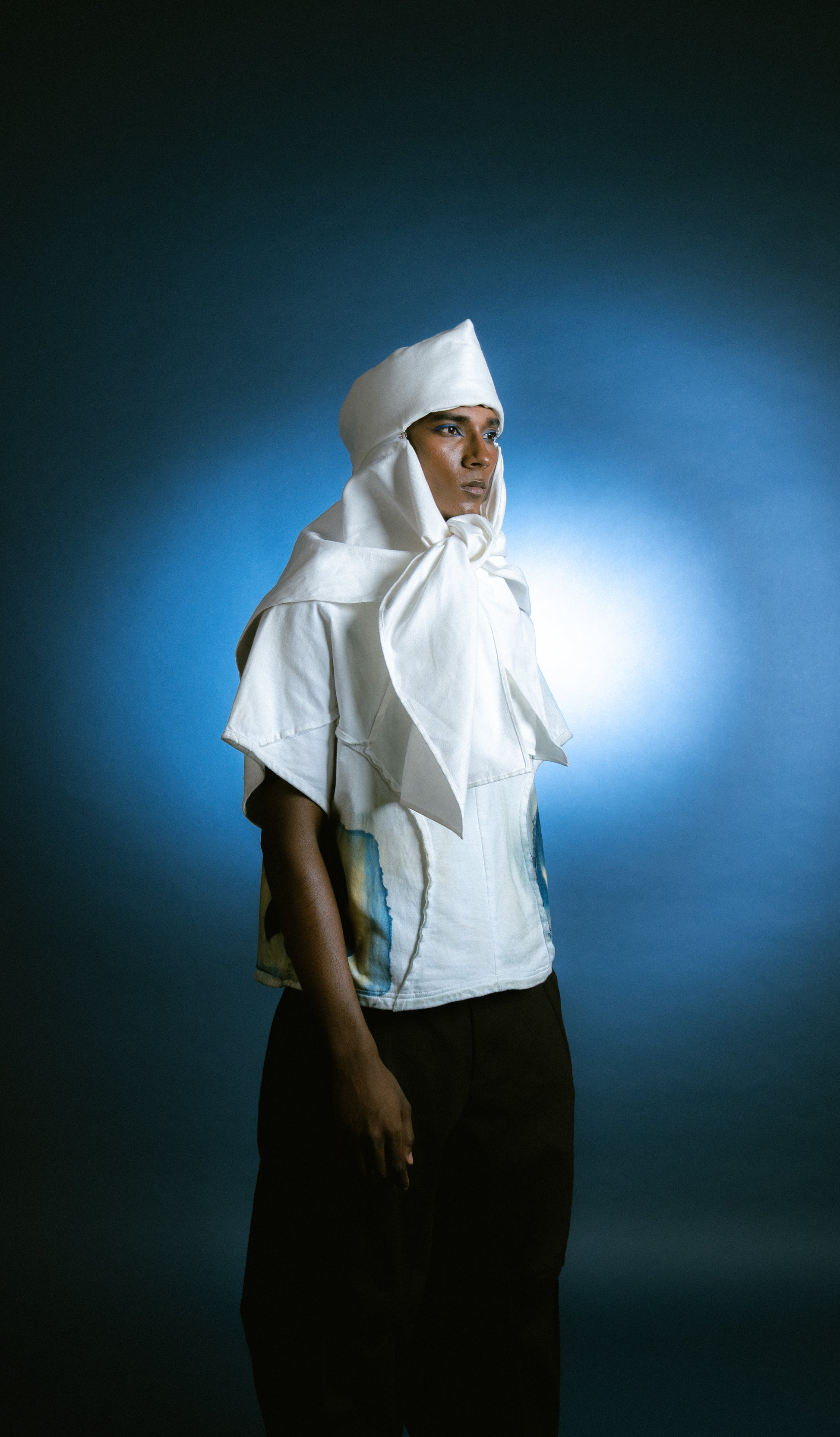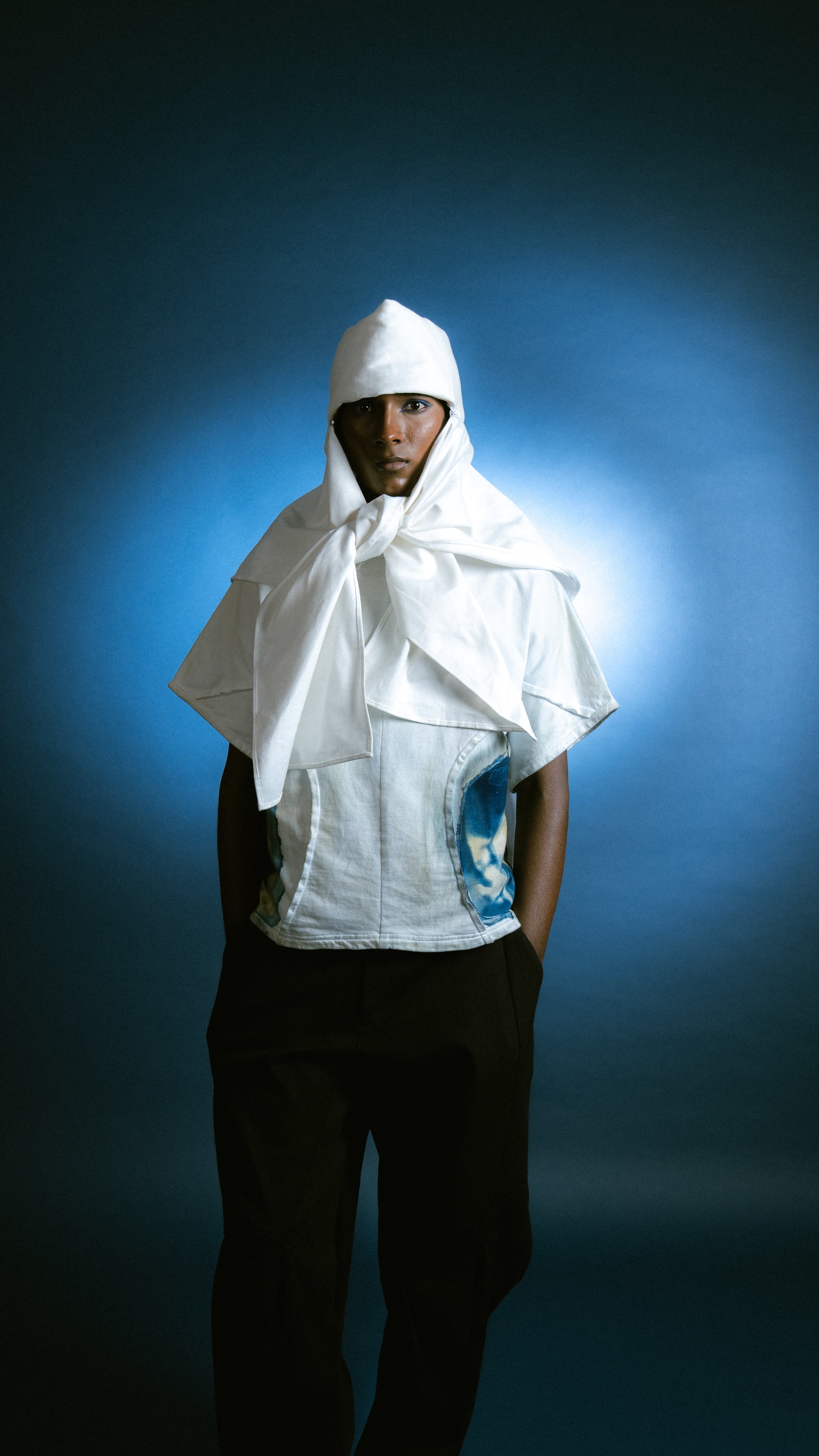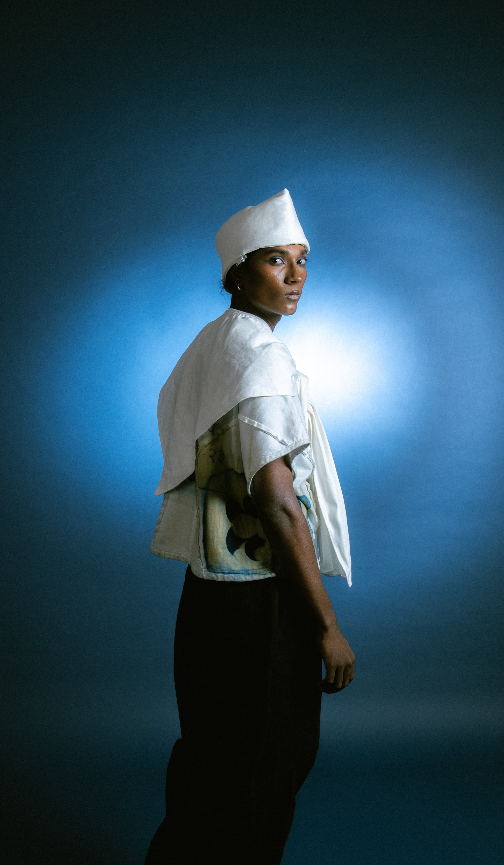 The Modular Nehru Topi elevates a classic symbol of work and identity. This padded cotton canvas hat is constructed in two parts—a hat and a scarf—joined with a zipper. The two can be worn together or separately, allowing for three unique silhouettes. The form is exaggerated at the crown, playing with proportion and presence.